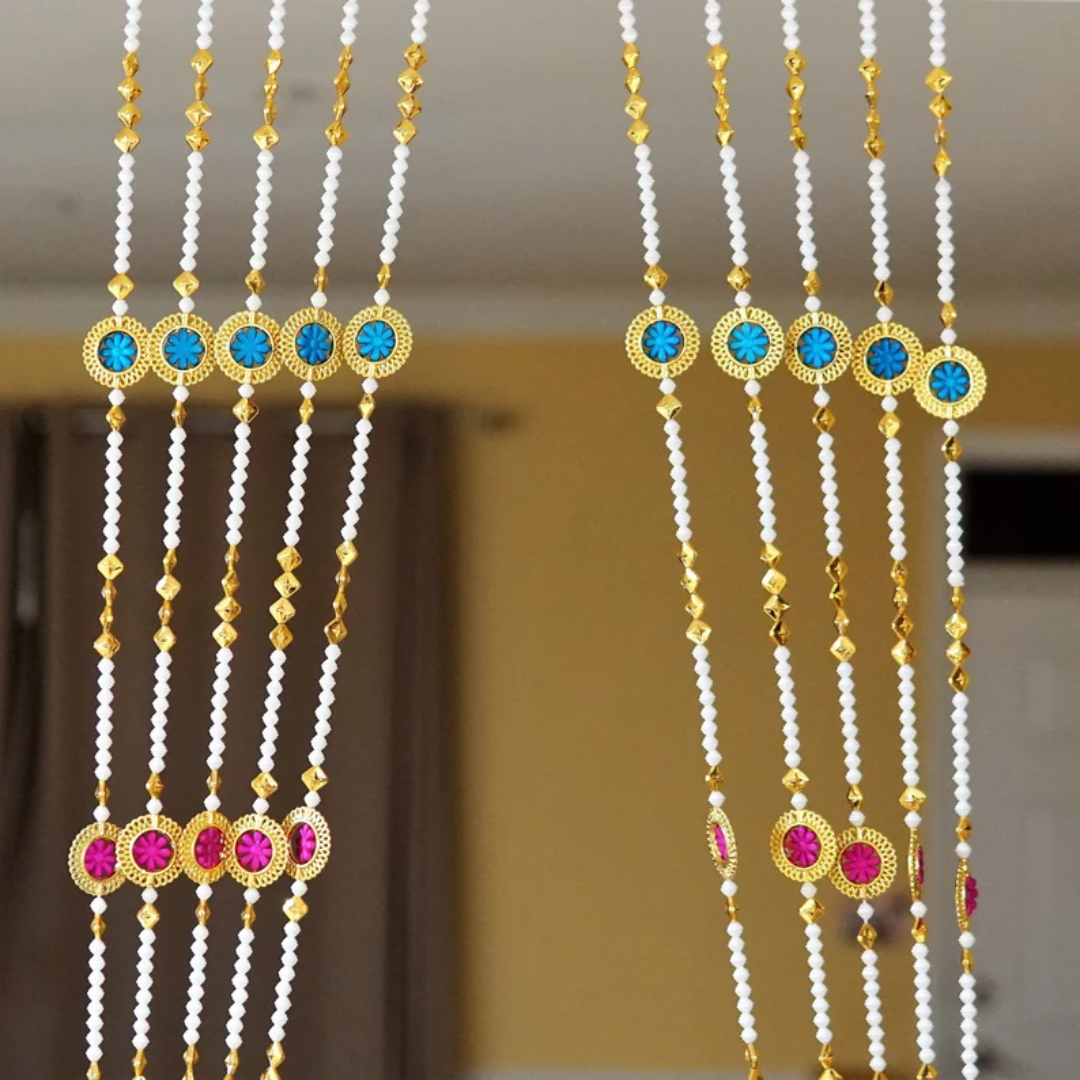 Add a vibrant bohemian touch to your home with this 10 PC colorful beaded curtain set. Handcrafted with gold, white, and multicolor beads, these Indian-style veils are perfect for doors, windows, hallways, or as a suncatcher. Ideal for hippie, gypsy, or festive decor themes.